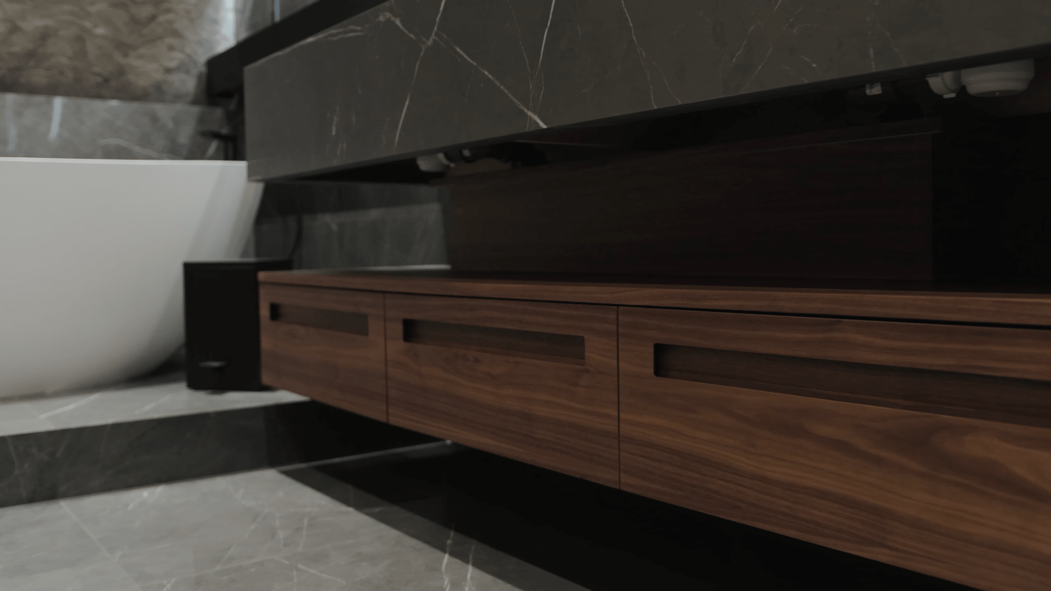 Modern handleless vanity made from natural wood veneer. Its minimalist design and smooth surfaces emphasize the elegance of contemporary interiors, while the natural wood grain brings warmth and style. A perfect choice for bathrooms that combine functionality with modern aesthetics